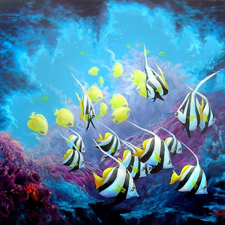 Por mim eu teria feito muito mais obras com esta temática, pois alem da riqueza visual que conseguimos alcançar com tamanha explosão de cores que é a vida marinha em corais... A diversidade de formas e nuances tonais fascina e encanta por tamanha beleza. Tenho quase cinco mil fotos de peixes e corais, também uso bastante a figura do peixe em obras surrealistas, como disse, além da diversidade de formatos, as cores são surpreendentes e absolutamente divinas.