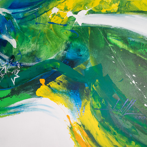 Uma tela de muita representatividade à bandeira do Brasil. Uma conjunção do verde e amarelo em harmoniosa dança com o azul no palco branco. Uma composição que visa um movimento dinâmico proporcionado por uma técnica suave e livre. Nuances de tonalidades com um toque de brasilidade exala uma alegria contagiosa e iluminada.