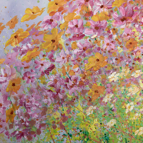 Agora vou apresentar a outra pintura com flores que fiz para a Joelma, um formato bem panorâmico para um quadro que ficará acima da cabeceira da cama... Uma obra de arte na mesma temática e paleta de cores da pintura Manhã Florida 1. Com um fundo bem suave e flores feitas com pinceladas soltas e despretensiosas, sem a intenção de se fazer as flores com perfeição - Longe disso, o intuito era deixar tudo bem livre e solto, para dar uma ideia de espontaneidade e leveza.
