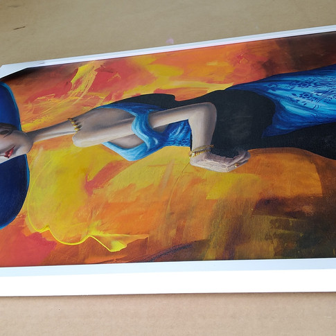 Esta obra de arte Carmella é uma peça atemporal, pois ela une as formas de uma pintura figurativa que o(a) expectador(a) vê logo de cara... Com um fundo abstrato de cores contrastantes. Não é um figurativo que mostra a figura em uma sala, ou com uma paisagem ao fundo - É uma composição que o fundo não interfere na atenção do motivo principal, ou seja, a figura da mulher ao centro.