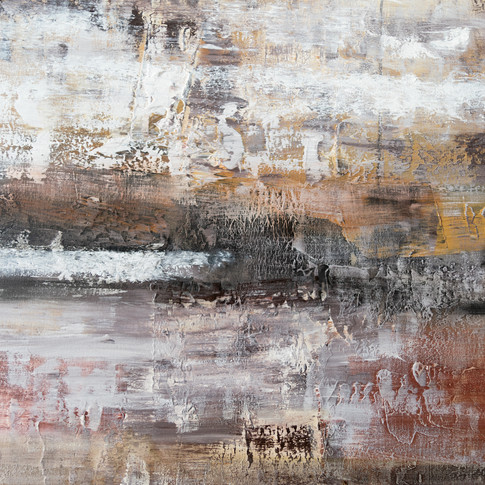 A tela abstrata protagonista da postagem foi uma pintura que me trouxe muito prazer em realizar, a começar da paleta de cores terrosas que trazem uma sensação de aconchego e conforto para o ambiente onde o quadro é instalado, pois remete a elementos naturais como madeira, palha, areia, terra, e o branco algodão. Uma composição que ora parece ser um fragmento de uma parede velha de uma casa de mais de 100 anos... Ora parece ser cartão postal de paisagens de outras dimensões, pois se analisarmos minuciosamente fragmentos da tela - cada área distinta remete a um cenário de um paraíso divergente, de um universo paralelo com ligações com nossa terceira dimensão, pois a tela é rica em texturas, passando longe de ser uma obra de arte lisa e pobre em relevos, muito pelo contrário, a tela é rica em uma gama grande de efeitos que saltam à superfície da pintura.